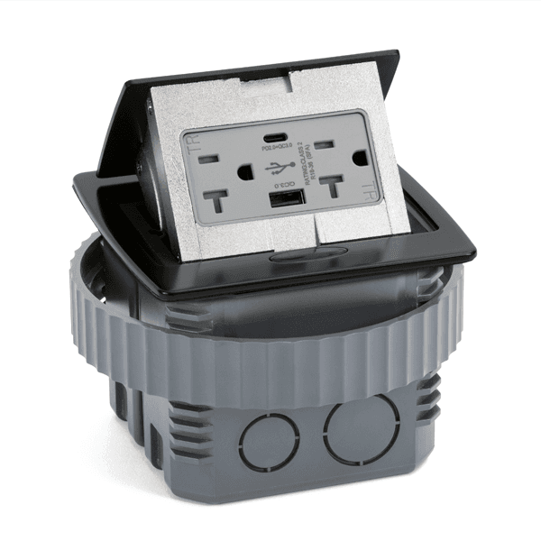 The sleek and compact design offers a great option for installing a pop-up outlet into a countertop or floor. Pops up while in use and is out of the way and flush with the countertop when pushed down. Featuring a 20 Amp receptacle with Type A and Type C USB ports. Available in a variety of finishes including black, stainless, white, and nickel silver.